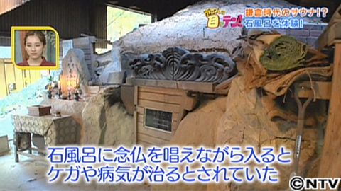 鎌倉時代のサウナ、石風呂。周りを石で囲んでその上に赤土塗って熱が逃げないようにしています。石風呂は、鎌倉時代、重源上人によって作られ石風呂の中で念仏を唱えると怪我や病気が治るとされていました。