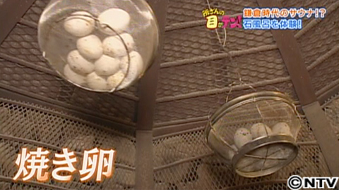 石風呂は、燃え尽きた灰や炭をかき出します。ホースの水をまき、火を完全に消します。石風呂の中に入り先ほど採った石菖をしきつめます。熱で石菖から香りが出やすくなるんです。その上にゴザを敷きます。そして、温まったこの中に入れるのが卵。卵を吊るして、40分おくと美味しい焼き卵になるんです。
