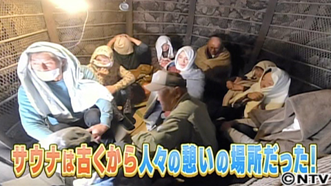 そして石風呂の完成。石風呂の上部は、120度以上の高温、床に近い部分はおよそ66度。頭が熱くなるため、毛布をかぶって入ります。タオルや毛布などをかぶり熱さ対策をして服のまま入るんです。都丸さんもタオルを巻き、毛布をかぶって準備OK!