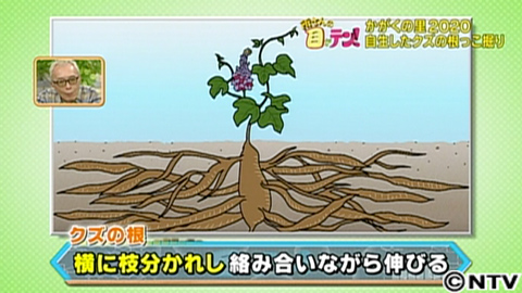 クズは夏場、勢いよくツルを伸ばすため、冬の間、そのエネルギーとしてデンプンを根に貯めます。そこはサツマイモのように太くなるのだそう。しかしクズの根は、まっすぐ下に生えているのではなく、横に枝分かれし、複雑に絡み合いながら伸びます。