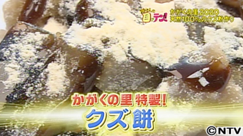クズ粉といったらクズ餅!まず、水に砂糖、そしてクズ粉を溶かします。それを火にかけ、かき混ぜていると、ところどころで、のり状に固まりはじめました!熱を加えるとデンプンが水を吸い、全体がお餅のようにネバネバに!あとは冷ますだけ!冷えて固まったら、食べやすい大きさに切り、定番の黒蜜と、きな粉を振りかければ、かがくの里特製、クズ餅の出来上がり!