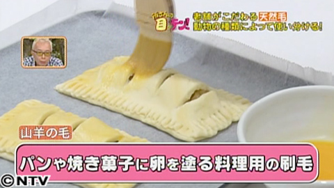 一方、山羊の毛は、細くて柔らかく、毛がちぢれているのが特徴。さらに寒く乾燥した高山に生息することから、空気や水分をためこむ性質があるんだそう。そのため、パンや焼き菓子に卵を塗るときなど、料理用の刷毛に適しています。
