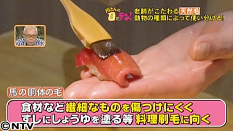 同様に、料理刷毛に使われているのが、山羊よりも柔らかい「馬の胴体」の毛。馬は哺乳類のなかでもとくに汗っかきで、その汗を効率よく落とすため、胴体の毛は表面がツルツルでまっすぐなんだそうです。食材を傷つけにくく、高級すし店などで、お寿司に醤油を適量塗るといった、繊細な作業に使われています。
