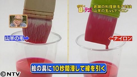目的によってうまく使い分けられている天然毛。では、化学繊維と比べ、どんな所が優れているのでしょうか?料理の刷毛を使って実験です!水をため込む性質の山羊の毛の刷毛と同じサイズのナイロンの刷毛を使って、絵の具に10秒間ひたし、線を引いてみます。