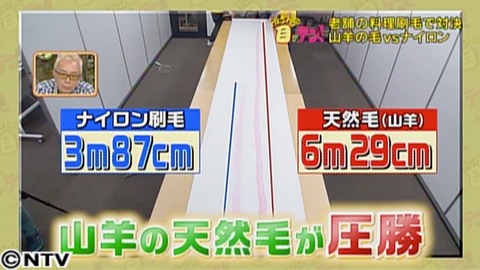 それでは実験スタート!向かって右が、山羊の天然毛、左がナイロンの刷毛です。両者とも順調に距離を伸ばしていきます!2mを超えたところで、ナイロンの刷毛の色がやや薄くなってきたように感じます。とここで、3m87cmでナイロンの刷毛が脱落!その後も山羊の刷毛はグングン距離を伸ばし、スタッフの想定をも超えてしまい下に敷いた紙を延長!そしてついに、山羊の刷毛も終了!結果はナイロンよりもなんと2m以上長い6m29cm。およそ1.6倍の圧勝でした!