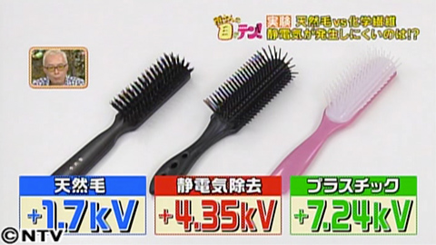 まずはプラスチックのヘアブラシから!結果は7.24kV。続いて、静電気除去機能を持つブラシ。両サイドに、電気を放出させる素材がついています。結果はプラスチックよりも低い、4.35kV。では、天然毛は本当に静電気が起きづらいのか?豚の毛のヘアブラシで実験です。なんと1.7kV。静電気除去ブラシよりも低いという驚きの結果に。