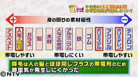 この図が帯電列というもの。左に行くほどプラスの電気、右に行くほどマイナスの電気を帯びやすい物質の一覧です。異なる2つの物質を摩擦した時、この位置が離れれば離れるほど大きな静電気が発生します。今回使ったプラスチックのブラシはポリエチレン、静電気除去ブラシはポリエステルが主な素材でした。人の髪の毛がプラス側の位置にあるのに対してプラスチックと静電気除去ブラシの素材はマイナス側。一方、豚毛は人の髪と、ほぼ同じプラスの位置にあるため、静電気がおこりにくかったんです。