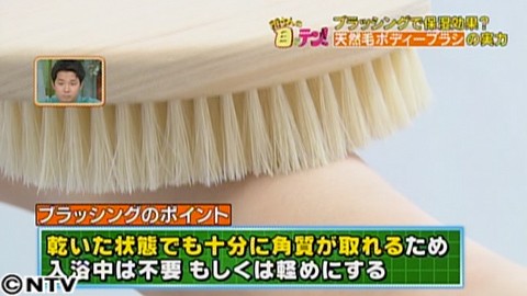 静電気が発生しにくい天然毛のヘアブラシ。さらに、ブラッシングには頭皮の血流をよくする働きがあると言います。その結果、髪が丈夫になり、抜け毛の予防なども期待できるんだそう。さらに、ブラッシングは髪だけでなく、肌の環境も改善してくれると言います。お風呂で体を洗うとき、天然毛のボディーブラシを使ってブラッシングをすると、ある効果が。