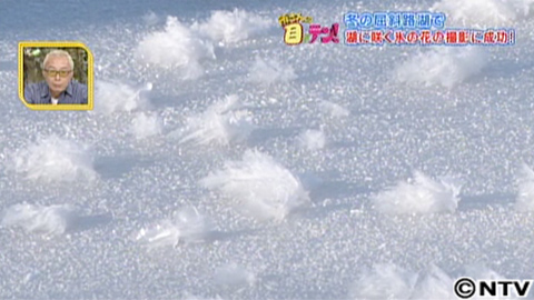 結晶が折り重なり、1つ1つがまるで花のよう。湖面一面に、氷の花が咲いています。めったに遭遇できない貴重な映像です!