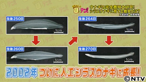 エサがわかったことで、ウナギの赤ちゃんは順調に育ち、柳の葉の形からだんだんとシラスウナギの形に成長。そして、、2002年、ついに人工シラスウナギに。