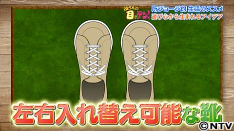 所さん発案のグッズはまだあります。左右入れ替えても履ける靴。所さんが考えたのは、形が左右対象の靴。中敷は自分の足の形に合っているため、靴が左右入れ替わっても、中敷を入れ直すことで履くことができる画期的な靴ができるというのです!