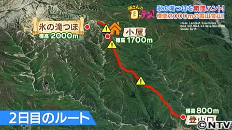金丸さんが目指す場所は、標高2700mの山の中腹にある氷の滝壺。登山ルート1日目は、2つの大きな難所を乗り越え、標高1700mの無人小屋を目指し、ここで夜を過ごします。2日目は、今回最大の難所である急斜面を登り、標高2000mの場所から氷の滝壺を見るというもの。距離は往復で20km。時間は20時間にもなります。