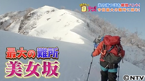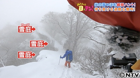 雪が降る中、氷の滝壺を目指し、午前5時50分、登山開始。すると、最初の難所が現れました。目の前に現れたのは、急な崖。最初の難所を登りきった金丸さん。しかし、吹雪に見舞われ、出発してわずか4時間で、気持ちもすさんでしまいました。疲労困憊の金丸さん。しかし、日暮れまでに小屋へたどり着かなければならないため、5分ほどの休憩で、すぐに出発です。