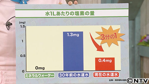水をおいしくないと感じる理由は、いくつかあります。その1つが「カルキ臭い」などと言われる塩素です。塩素は、基本的に硬水、軟水ともにミネラルウォーターには入っていません。その一方で、30年前のある浄水場では、水1リットルあたり1.3mg入ることがあり、カルキ臭いと言われる原因になっていました。ところが、現在は3分の1の0.4mgにまで抑えられています。