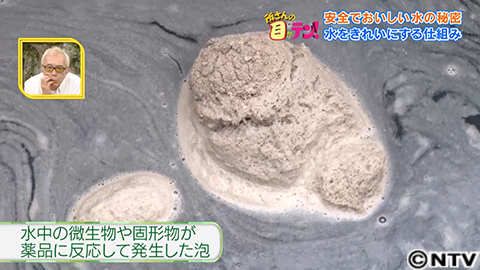 まずは、急速かくはん池。最初に塩素を入れることで、浄水場で雑菌が繁殖しないようにします。さらに、ごみを固める「PAC」という薬品も入れられます。すると、水に含まれる微生物や固形物が薬品に反応して茶色い泡が発生。