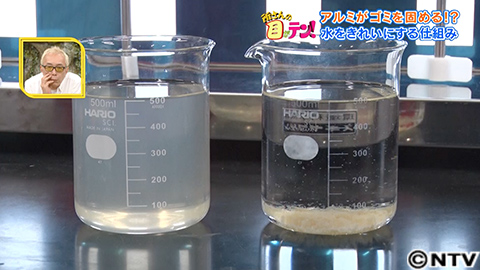 ここで実験。用意したのは、東京の江戸川で汲んだ水。そこに、ポリ塩化アルミニウムの液を入れて、かき混ぜること5分…水が透明に。