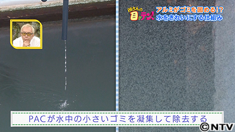 川から来た水に含まれる小さなゴミを取り除いた「PAC」という薬品の正体は何だったのでしょう。水質浄化の専門家、中央大学の山村教授によると、それはポリ塩化アルミニウムという薬品。アルミは、水に溶けると水酸化アルミニウムという物質に変わる。その水酸化アルミニウムが、汚れを落とす役割をしているんです。