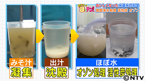 高度浄水処理された味噌汁は、限りなく水に近づいた味。味噌汁を、ポリ塩化アルミニウムで凝集させ、オゾン処理と活性炭処理を行うことで、ほぼ水にすることができました!