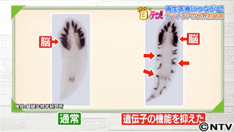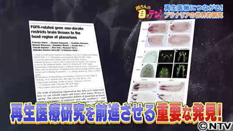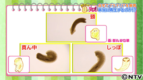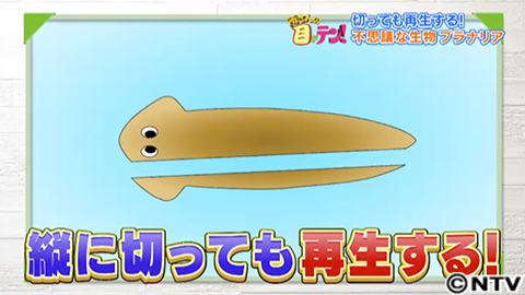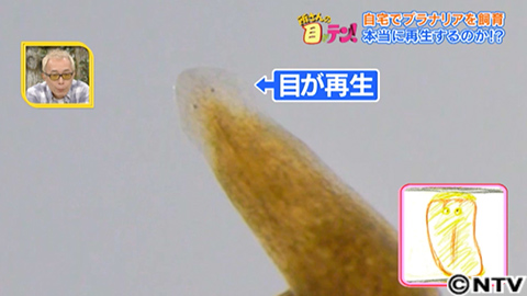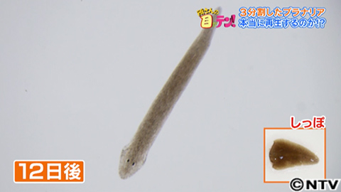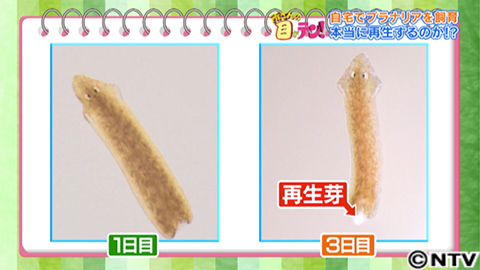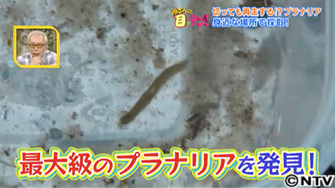 ここから、最も重要な実験。例えば、プラナリアを3等分にしたら、最終的に3つのプラナリアが誕生すると言うのです。自然界で生きているプラナリアも、エサが豊富にあり、大きくなると、自らちぎれて数を増やすと言います。今回は、それを人工的に再現。