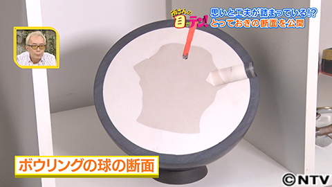 断面を見て気づくのは、中心にある不思議な形をした色の濃い部分。これは「コア」と呼ばれる重りだそうで、この形をデコボコにすることで、ボールの重心が中心からずれて、投げた時に曲がりやすくなるのだとか。コアには色々な形があり、それぞれ曲がり具合も違うので、プロは、コアの形と曲がり具合でボールを選ぶのだそうです。
