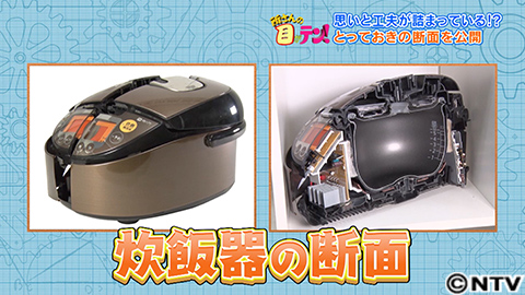 うち鍋の下に加熱板があり、これで鍋を加熱していることがわかります。真っ二つにして見えた工夫が、スチームキャップの部分。蒸気を外に出す穴だけではなく、「おねば」と呼ばれる、ご飯のおいしさにとって重要なでんぷん類を逃さない設計になっているのです。