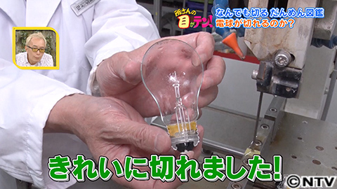 普通の電動のこぎりでは割れてしまう、薄いガラスの白熱電球も、帯鋸ならヒビ一つ入らず真っ二つ。お見事!