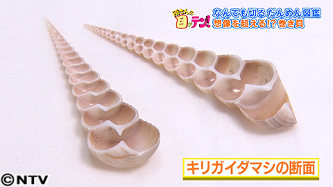 螺旋状に何層にも巻かれた形が特徴のキリガイダマシ。巻貝は成長にともない、殻の口の周りに膜を形成し、螺旋を描くように徐々に大きな殻を作っていきます。そのため、切断すると、大小異なる同じような口の形が、ズラリと並ぶんです。