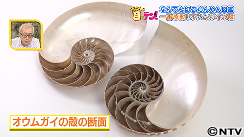 舟久保さんが、真っ二つにして一番感動したというのが、オウムガイの殻。4億年前から、ほとんど姿を変えていない「生きた化石」で、タコやイカの仲間なんです。