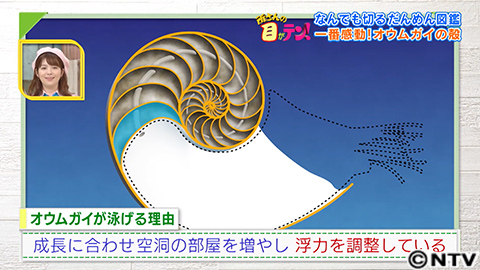 生体が入る場所以外に、丸い壁で仕切られている部屋がたくさんあります。オウムガイを研究する横浜国立大学の和仁准教授によると、これは、オウムガイが海の中を泳ぐときに必要なものだというのです。オウムガイは成長して体が大きくなるたび、殻の液体を少し抜いて、この空洞の部屋を作っていきます。体が重くなっても、空洞の部屋を次々と増やすことで浮力を調整していたのです。