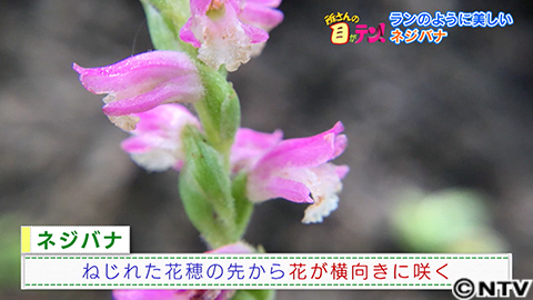 次に見つけたのは、茎に対して、クルクルと螺旋状に咲く花の様子から名がついた「ネジバナ」。花は7ミリと小さいですが、ねじれた花穂の先から花が横向きに咲いています。
