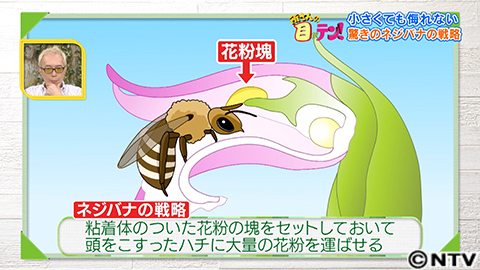多田さんによれば、この花にも驚きの繁殖戦略があると言います。ネジバナの花の中には、蜜のほかに花粉の塊も隠してあります。虫が蜜を取りにやってきたら、花粉の塊を粘着テープのようなもので虫にくっつけて、一度に大量の花粉を運ばせる戦略をもっているのです!