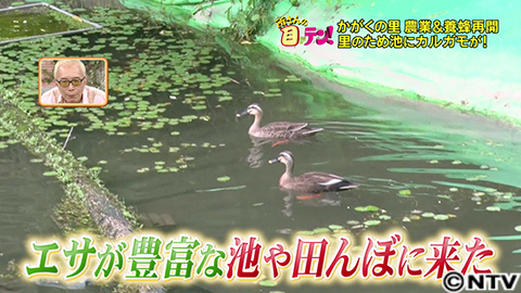 阿部さんと西野さんが梅干し作りをしていた時、嬉しいサプライズ!里の小さなため池に、目の黒いラインが特徴の“カルガモ”です。やってきた2羽は、おそらくつがいのようで、つがいで行動するのは、春から夏の繁殖期の間。