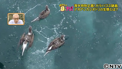 すると、青い足が特徴のアオアシカツオドリが、海をめがけ、続々と飛び込んでいます。魚を捕るため羽をたたみ、水の抵抗を最小限に抑え、最大20mの深さまで潜るのだそう。