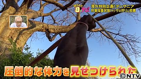 鳴き声を頼りに獲物を探し、木の上に、ホロホロチョウを発見!矢を放ち、見事、狩猟犬がホロホロチョウを確保!この狩りで、ハッザの圧倒的な体力を見せつけられました!