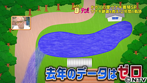 ところが…秋、大型台風に襲われ、池が増水。あふれた水に乗ってウナギが逃げ出し、去年のデータは、まさかのゼロ…。