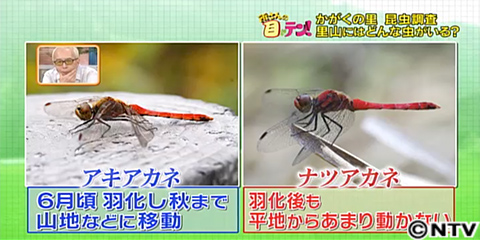 似ているのに『アキアカネ』がいて、この時期は山の高いところで避暑しているそうです。ナツアカネは、ずっと林の中にいますが、アキアカネは、涼しくなると山から下り、9月終わりか10月頃に、田んぼで産卵するのだそう。