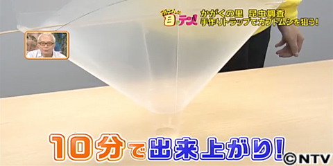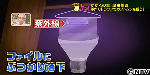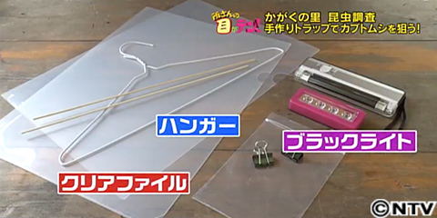 まず、片方を切って開いたA3クリアファイルの両はしを折ってホッチキスで止め、竹ぐしを通します。これで虫がぶつかる衝撃板は完成。今度は、A4クリアファイルの角など2か所をカット。この時、竹ぐしが通せる張り出しと穴を開けておきます。あとは、衝撃板とハンガー、ブラックライトを固定し、先ほど作ったファイルに竹ぐしを通します。最後に、ファイルの穴にカップを入れれば、たった10分で簡単トラップの出来上がり!