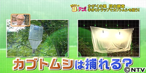 これを裏山に4か所設置。最後に仕掛けたのは、白い布に、紫外線の含まれる水銀灯の光を当てることで、一度に多くの昆虫を引き寄せることのできる、「ライトトラップ」という仕掛け。果たして、カブトムシは捕れるのか?