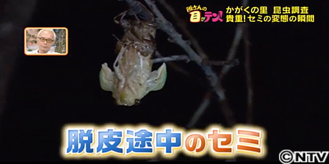 夜10時半。山に入ると、枝で脱皮中のセミを発見!