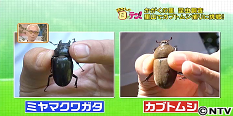 時期外れなのに、手作りの仕掛けで、カブトムシとミヤマクワガタのメス1匹ずつを捕ることができました。