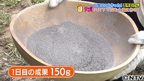燃やした燃えかすをふるいにかけて、できた灰の重さを量って途中経過をみてみます。なんと、1日目の成果は、たったの150g!目標の2.5kgまでは、まだまだです。