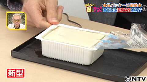 下村先生おすすめのパッケージは、豆腐。一体どこが進化しているのでしょうか?旧型の豆腐容器のフタを開けてみると、フチの部分が破れてフタが開けられません。
