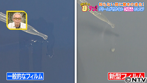 一般的なフィルムの場合、油をはじくことなく、べたっとしますが、新型のフィルムでは、油が玉のようになり、コロコロと転がっていきます。