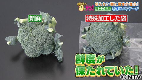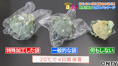 まず、一般的な袋の方は、発酵したようなにおいが。ブロッコリーは、大根と同じアブラナ科の一種。アブラナ科の野菜には硫黄を含む成分が多く含まれており、酸欠になると、この成分が化学反応を起こし、たくあんと同じような臭いを発するようになるんです。