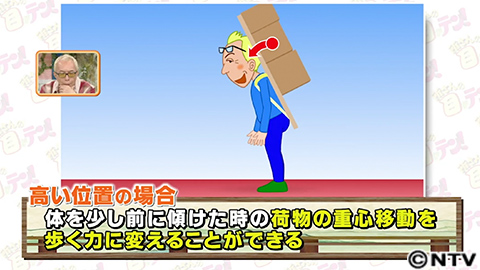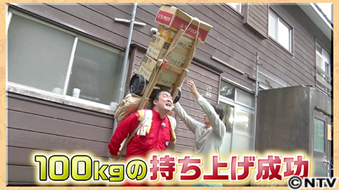 石髙さんは、荷物を前にかがめ、軽々と立つことに成功!そしてコネオさんも挑戦です!コネオさんは大学時代、ボート部でキャプテンを務めていた体力自慢!なんと100kgの荷物を1回で持ち上げる事に成功!