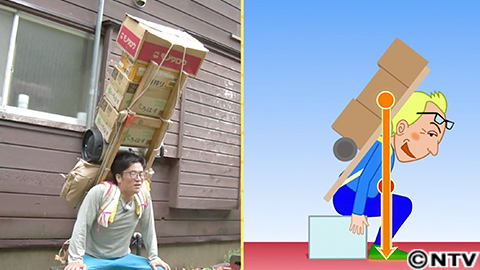 さらに、荷物を持って立ち上がるには、足の位置、自分自身の重心の位置、そして、荷物の重心の位置、これを一直線になるようなタイミングを見計らって立ち上がるということが、一番重要になるんだそう。歩荷さんの立ち方は、荷物の重心位置を前に傾けていって、重心位置と自分の腰の位置、そして足の位置がピッタリ合ったその瞬間に、スッと立っているんです。