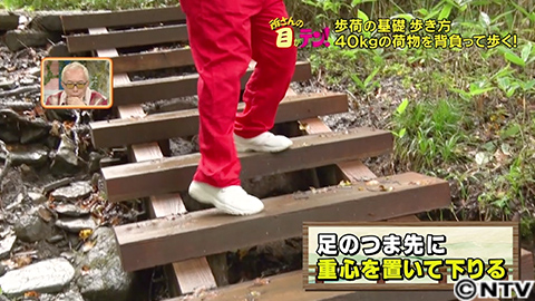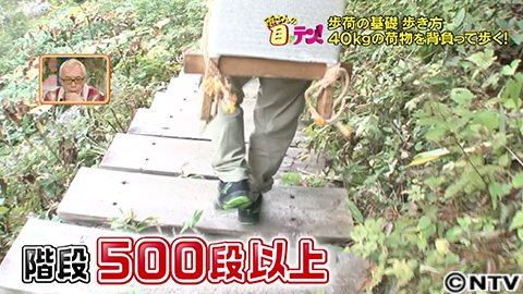 続いては、歩荷としての歩き方を教わっていきます! 練習のため、コネオさんは40kgの荷物を背負い、歩いていきます。