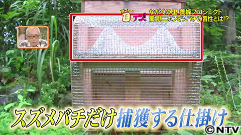 すると、オオスズメバチが中に入り巣箱に入ろうとしますが、網のため、中には入れません。スズメバチには、明るい場所と上に向かう習性があるので、そのまま捕獲器の上にあがっていきます。オオスズメバチを見事捕獲できたんです!ろうと状の入り口は、スズメバチにとって、一度入ったら出られないもの。体の構造上、細い方から戻るのが難しいんです。