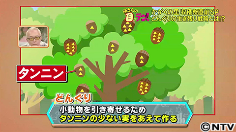 それでもめげない村田先生は、ドングリコーヒーになるドングリを、山に探しに来たのです。村田先生によると、マテバシイとは違い、里のドングリには、ある物質が入ってるそうで、それは、タンニン。タンニンとは、シブガキやお茶の葉などにも入っている渋い成分。実は植物にとっては、タンニンが生き残り戦略に大きくかかわっているそう。