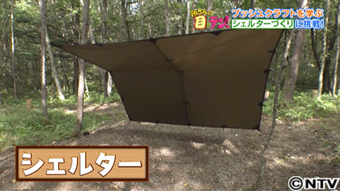 他にも4つのロープワークを教えてもらい、真剣に学ぶこと、1時間。早速、タープを張ってシェルターを作っていきます。これでシェルターが完成。